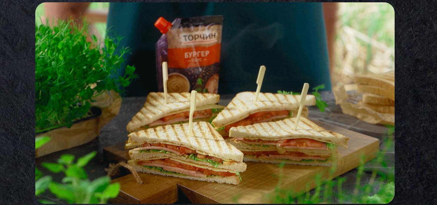- Накрийте іншим тостом, попередньо змащеним соусом Торчин® “Бургер”. Не економте соус, він додасть соковитості сендвічу.